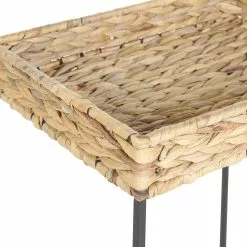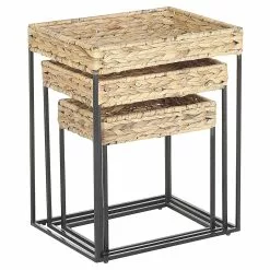 Añade funcionalidad y modernidad a tu sala de estar con este conjunto de 3 mesas de centro. Está fabricado a partir de jacinto de agua de alta calidad. El tablero de mimbre natural y la estructura de metal realzan la decoración de cualquier espacio de estilo boho o retro. Cada mesa presenta un tamaño distinto, por lo que se pueden apilar con facilidad.