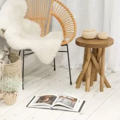 Mesa de café o taburete – este mueble es extremadamente versátil. Sus patas de madera sin tratamiento y alineadas en diferentes formas crean un aspecto excitante y extraordinario. Esta mesa redonda es un lugar perfecto no solo para un vaso de agua o un libro, sino también para todos los elementos decorativos con encanto que harán que tu hogar sea aún más hermoso.