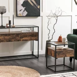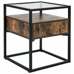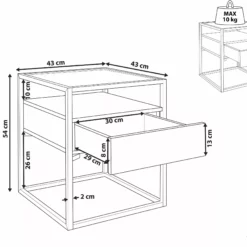 Añade a tu sala de estar o dormitorio esta mesa auxiliar de diseño industrial. Está fabricada a partir de MDF resistente y de alta calidad. El cajón ofrece un espacio de almacenaje extra y optimiza el área disponible en la habitación. La estructura de metal garantiza la máxima estabilidad.