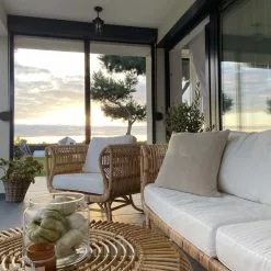 Una mesa de centro con estilo no está reservada para interiores. Este mueble, diseñado para el uso en exteriores, presenta un aspecto rústico gracias al ratán. La estructura se basa en un marco de metal que asegura estabilidad. Combina bien en un ambiente boho.