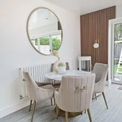 Esta mesa de comedor combina a la perfección en cualquier interior de estilo moderno, minimalista e industrial. Está fabricada a partir de MDF duradero y de bajo mantenimiento. La base fina y la pata de metal garantizan la máxima estabilidad. Combina bien con sillas a juego.