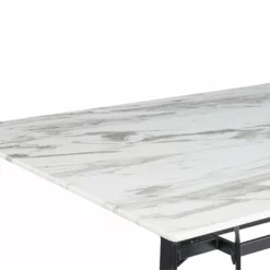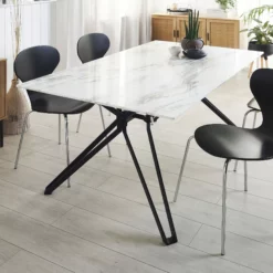 Realza la decoración de tu interior con esta mesa de comedor. Está fabricada a partir de vidrio templado duradero y de bajo mantenimiento. El tablero está recubierto de un material que recuerda al mármol. Presenta una capacidad para 4 personas. Las patas de metal de aspecto contemporáneo ofrecen la máxima estabilidad.