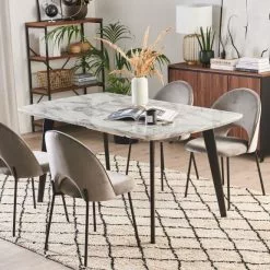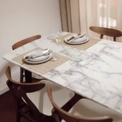 Renueva tu espacio con esta mesa de comedor rectangular. Fabricada de MDF duradero y de fácil mantenimiento. El tablero, revestido con chapa de mármol, permite combinar la mesa con otros estilos de decoración contemporáneos, convirtiéndola en el centro de atención. Con capacidad para 4 personas, cuando se extiende, ofrece 2 asientos más.