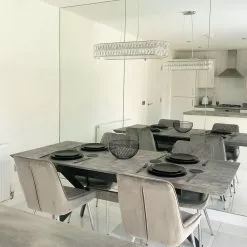 Añade un toque industrial a tu interior con esta mesa de comedor. Está fabricada a partir de MDF resistente y de bajo mantenimiento. El efecto cemento combinado con las patas de metal encaja bien en cualquier espacio moderno. Gracias a su extensión, puede dar cabida hasta 8 personas.