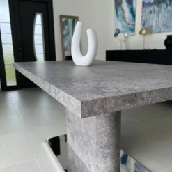 Decora tu comedor con esta mesa única en color y estructura de hormigón. Este modelo rectangular clásico con la base central garantiza más espacio para sentarse debido a la falta de las patas laterales. La base estable elaborada de acero inoxidable combina perfectamente con el tablero hecho de la placa MDF. La estructura de hormigón hace resaltar el carácter urbano de la mesa. Puedes estar seguro que esta pieza será el punto central de tus encuentros familiares.