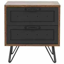 Añade a tu dormitorio esta mesa de noche práctica y funcional. Está fabricada con tablero de partículas de alta calidad. Incluye 2 cajones espaciosos. Las patas finas aportan un toque industrial a cualquier interior.